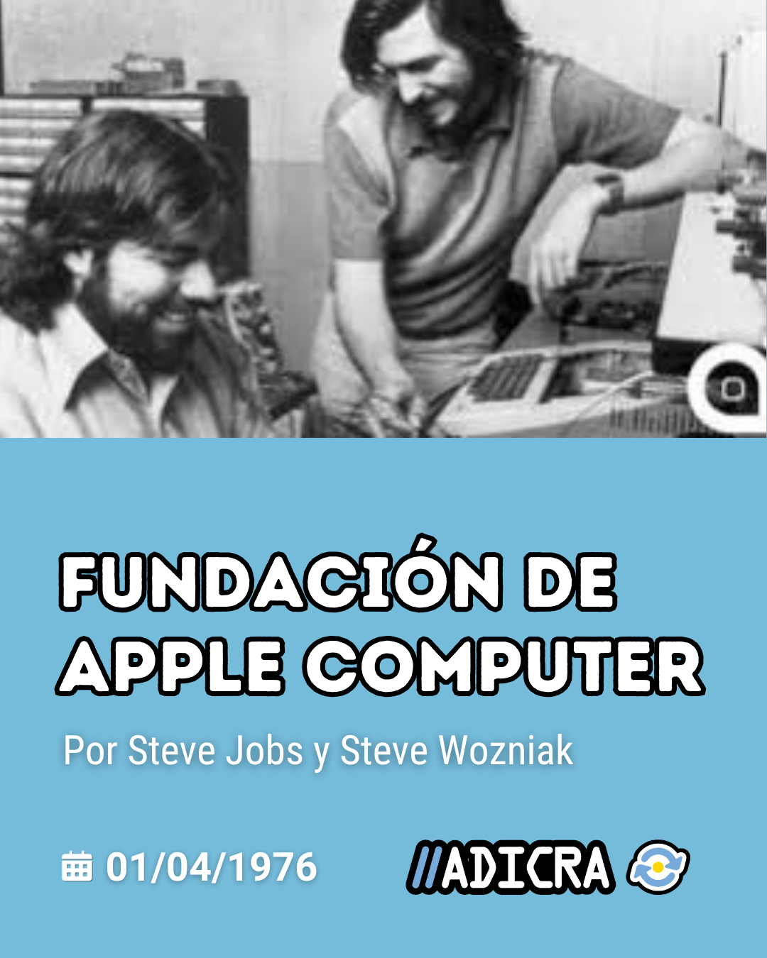 Steve Jobs y Steve Wozniak se conocieron muy jóvenes, en 1971, cuando un amigo mutuo los presentó. Con el tiempo, «Woz», apasionado de la electrónica, comenzó a dedicarse con Jobs a lograr un diseño de computadora. Tras varios intentos, finalmente sus esfuerzos dieron como resultado lo que sería la Apple I. Fue tan exitosa su presentación que Jobs rápidamente vio la oportunidad de un negocio. Al poco tiempo empezaron a recibir pequeños encargos de aquellas computadoras construidas artesanalmente, llegando a vender unos 200 ejemplares. Finalmente, Jobs conoció a Mike Markkula, que invirtió 250.000 USD, creándose así el 1 de abril de 1976, Apple Computer, a través de un contrato.